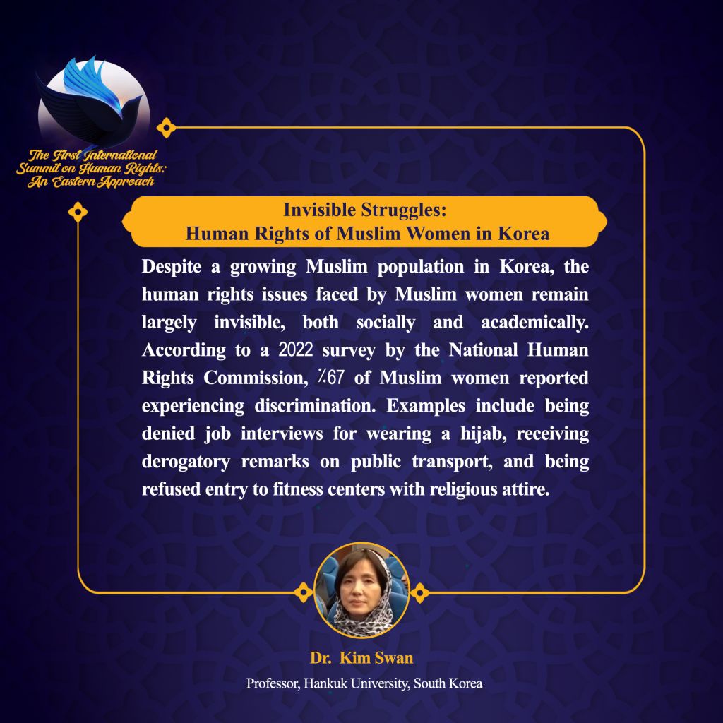 Despite a growing Muslim population in Korea, the human rights issues faced by Muslim women remain largely invisible, both socially and academically. According to a 2022 survey by the National Human Rights Commission, %67 of Muslim women reported experiencing discrimination. Examples include being denied job interviews for wearing a hijab, receiving derogatory remarks on public transport, and being refused entry to fitness centers with religious attire.