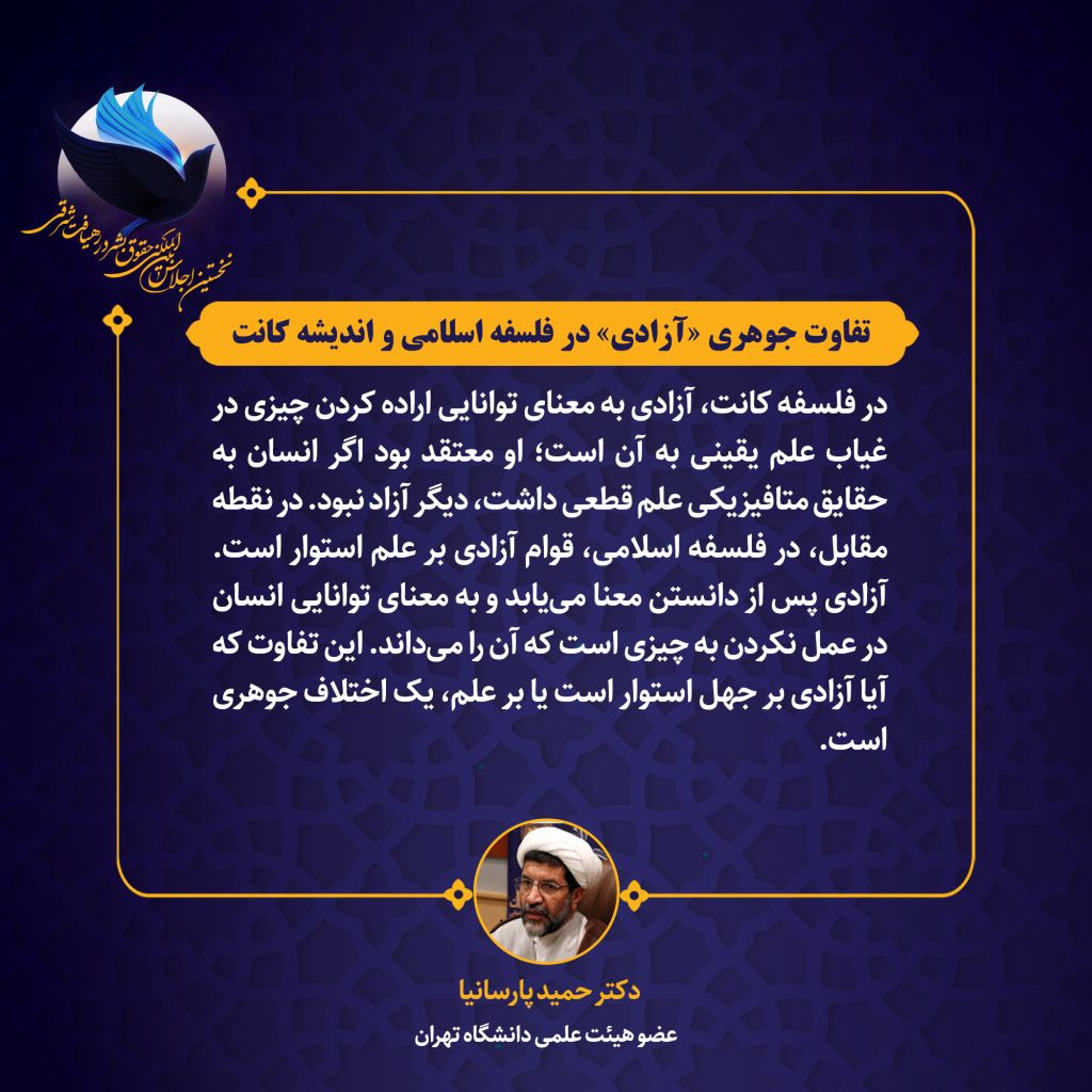 در فلسفه کانت، آزادی به معنای توانایی اراده کردن چیزی در غیاب علم یقینی به آن است؛ او معتقد بود اگر انسان به حقایق متافیزیکی علم قطعی داشت، دیگر آزاد نبود. در نقطه مقابل، در فلسفه اسلامی، قوام آزادی بر علم استوار است. آزادی پس از دانستن معنا مییابد و به معنای توانایی انسان در عمل نکردن به چیزی است که آن را میداند. این تفاوت که آیا آزادی بر جهل استوار است یا بر علم، یک اختلاف جوهری است.